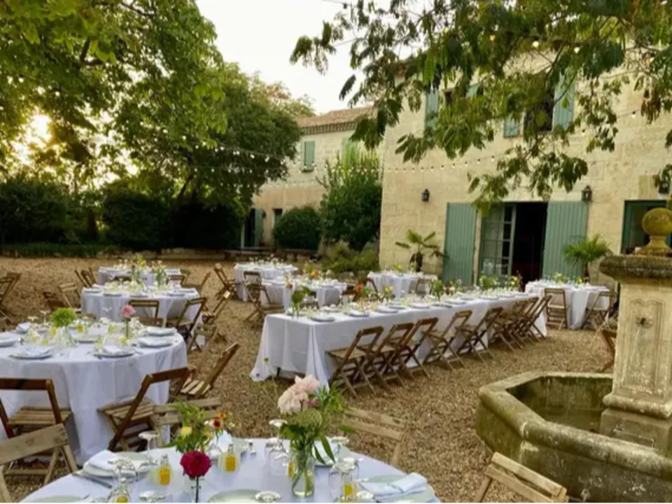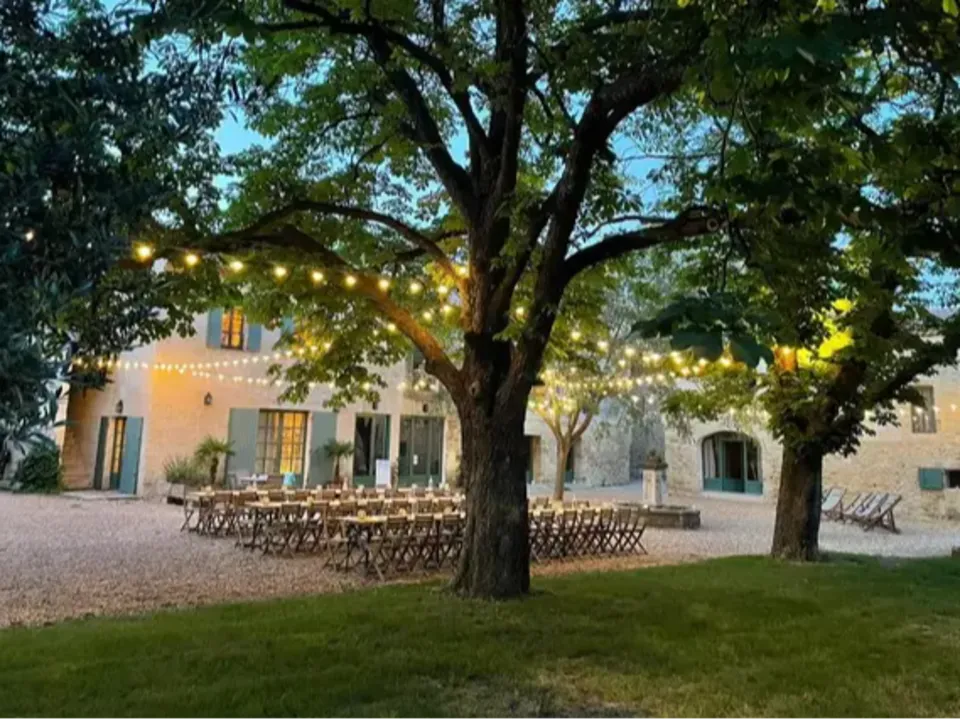 Les espaces de réception s'articulent autour de lieux emblématiques : Une cour majestueuse de 1500m² ombragée par des arbres centenaires Deux piscines avec terrasses pour des moments de convivialité 450m² de salles intérieures climatisées pour un plan B rassurant Un parc verdoyant ponctué d'oliviers et de grenadiers L'hébergement sur place peut accueillir jusqu'à 54 personnes, réparties dans plusieurs demeures de caractère dont le Mas des Oliviers et le Mas des Chênes.