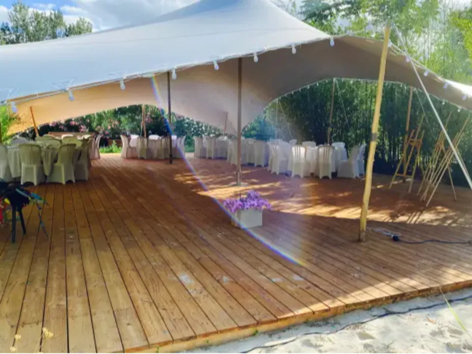 Sa toile tendue, soutenue par des mâts en eucalyptus, offre une acoustique exceptionnelle pour vos soirées dansantes, tandis qu'un plancher de 180m² apporte confort et raffinement.