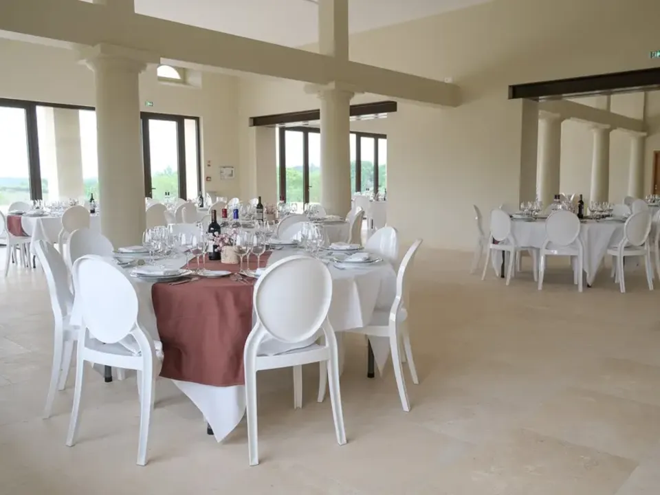 Sa conception soignée peut accueillir jusqu'à 160 convives dans un confort optimal, avec un aménagement pensé pour tous, y compris les personnes à mobilité réduite. Le mobilier élégant, composé de tables rondes et de chaises médaillon blanches, apporte une touche de distinction à votre réception. La terrasse panoramique surplombant les vignes offre un cadre romantique idéal pour vos cocktails et moments de convivialité.